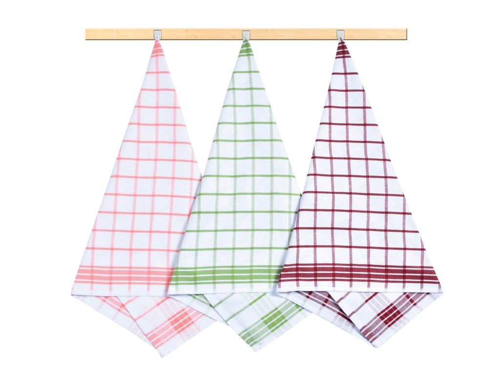 Kuchyňské utěrky jsou vyrobeny ze 100% bavlny o plošné gramáži 240g/m2. Jsou dostatečně velké a velmi dobře savé, v různých barevných variacích a dezénech. 100% bavlna zajišťuje dostatečnou savost použitého materiálu. Balení obsahuje tři kusy utěrek, barevnost utěrek může být odlišná oproti vyobrazení.