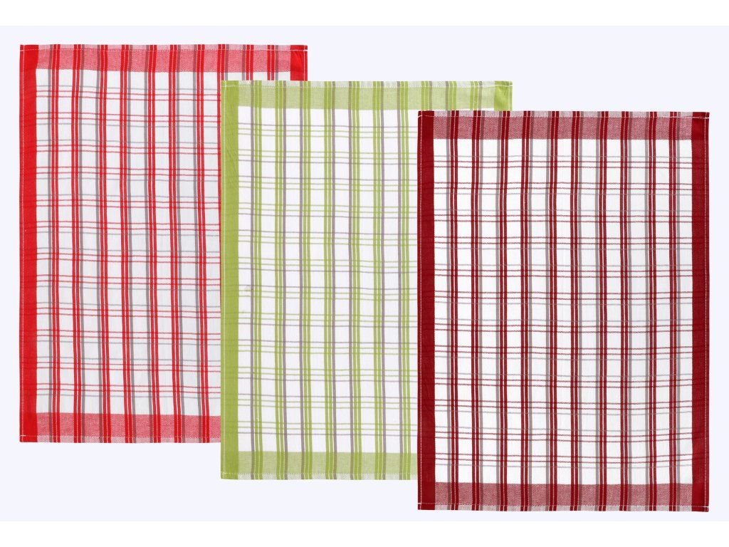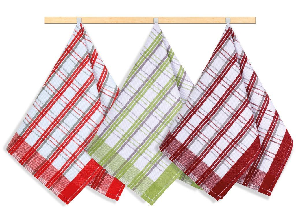 Kuchyňské utěrky jsou vyrobeny ze 100% bavlny o plošné gramáži 240g/m2. Jsou dostatečně velké a velmi dobře savé, v různých barevných variacích a dezénech. 100% bavlna zajišťuje dostatečnou savost použitého materiálu. Balení obsahuje tři kusy utěrek, barevnost utěrek může být odlišná oproti vyobrazení.