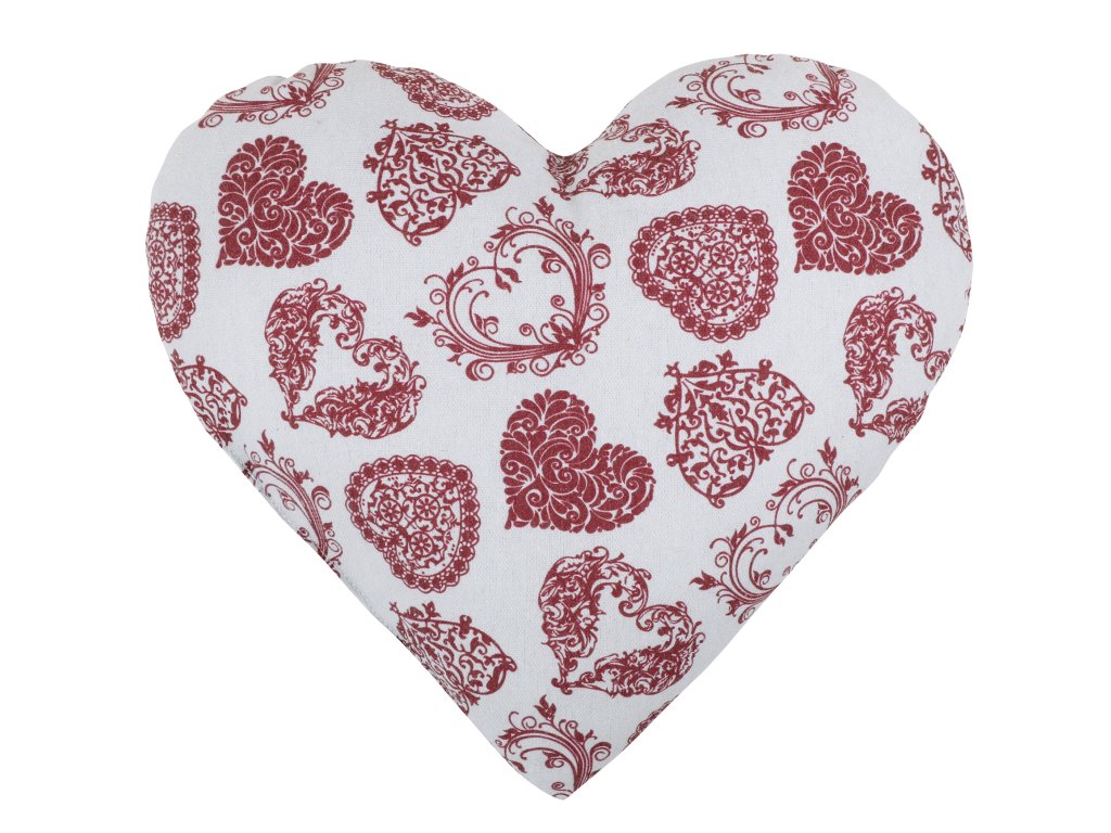 Romantický polštářek ve tvaru srdce je krásným doplňkem, který vnese do interiéru lásku, pohodu a něžnou atmosféru. Jemný světlý podklad zdobí bohatý vzor červených srdcí s ornamenty, díky kterému polštář působí elegantně i hravě zároveň.
